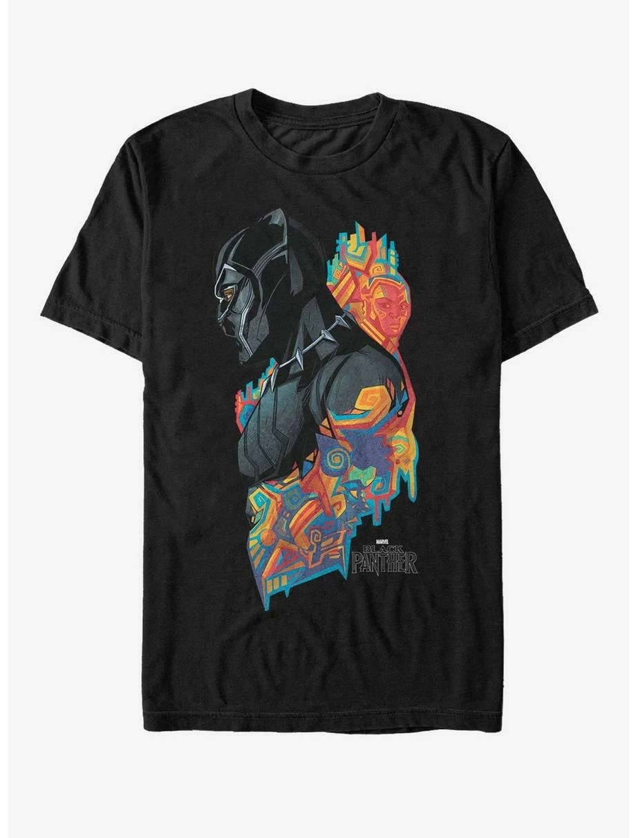 The Black Panther needs the help of the Dora Milaje warriors to help protect the Marvel Black Panther 2018 Artistic Pattern Men’s T-Shirt. This cool men’s tee shows off Black Panther in an artistic colorful pattern, while the head of his secret forces, Okoye, watches over him from the background.
